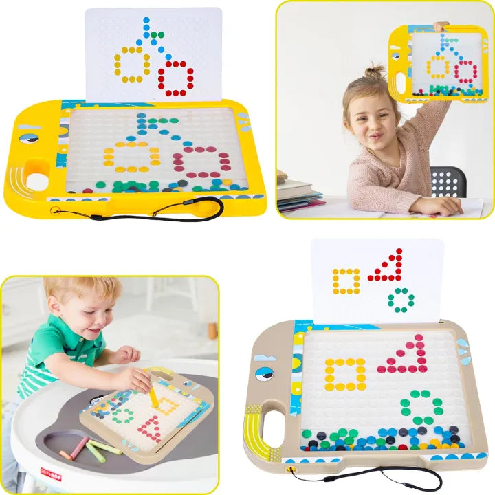 Magnetic Pen Movement: Children use the included magnetic pen to push the colorful metal beads up to the surface, allowing them to draw, write, and create designs based on the guiding template cards or their own creativity.